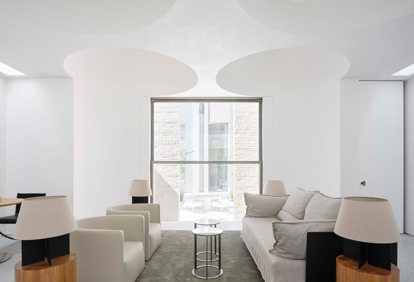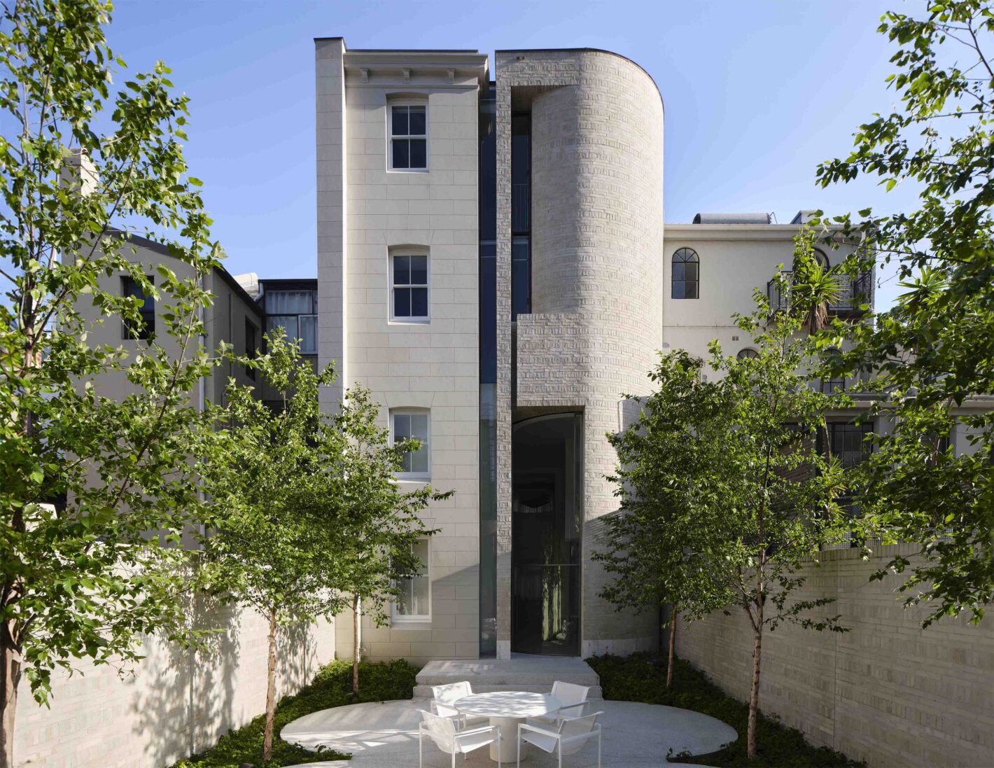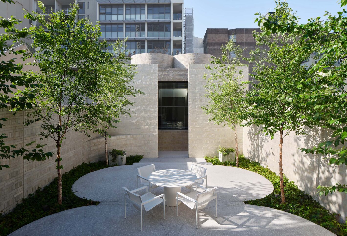 The building’s quatrefoil motif breaks away from the conventional. At the rear of the terrace is a dramatic double height form with light, invited from concealed windows, bouncing off curved and rendered walls. This pattern of intersecting circles extends into the landscape as a stepped terrace encompassed by monolithic brick walls on each side. These moves create a vast outdoor room with light filtered through an arcade of deciduous trees.