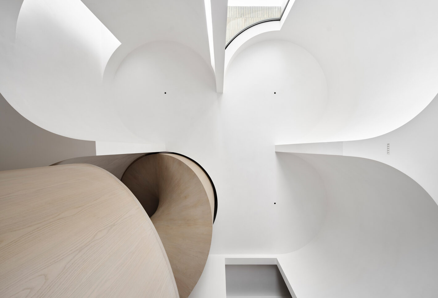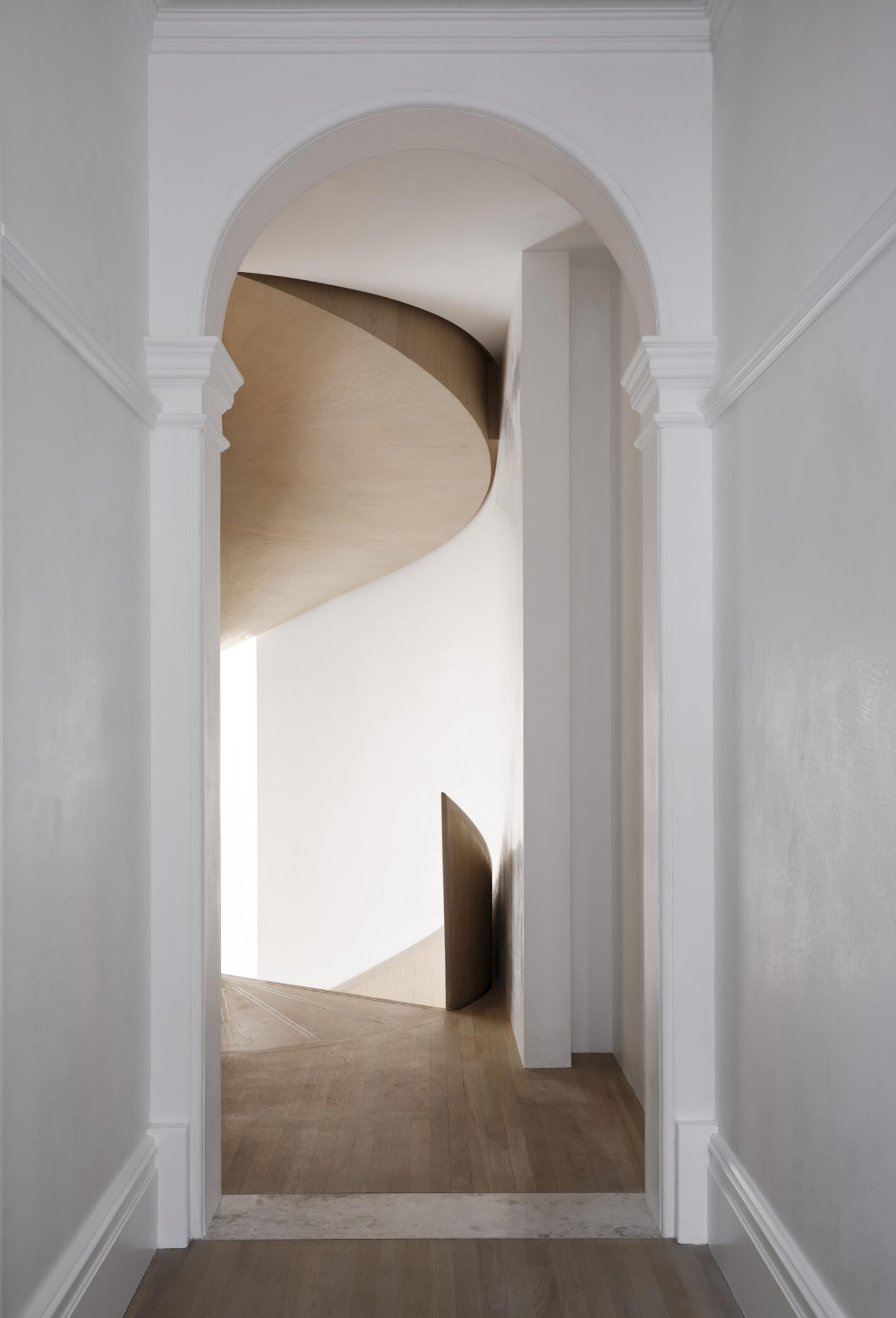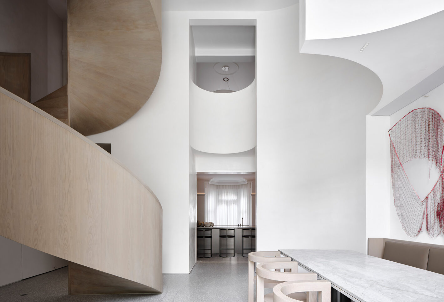The newly introduced architectural elements act as framing devices, protective walls and recurring sculptural motifs. At times the forms peel away to diffuse natural light, suggesting movement, and generating voids to conceal lighting, structure and services. At other times they become rendered backdrops for bedrooms and a helical spiral staircase.
