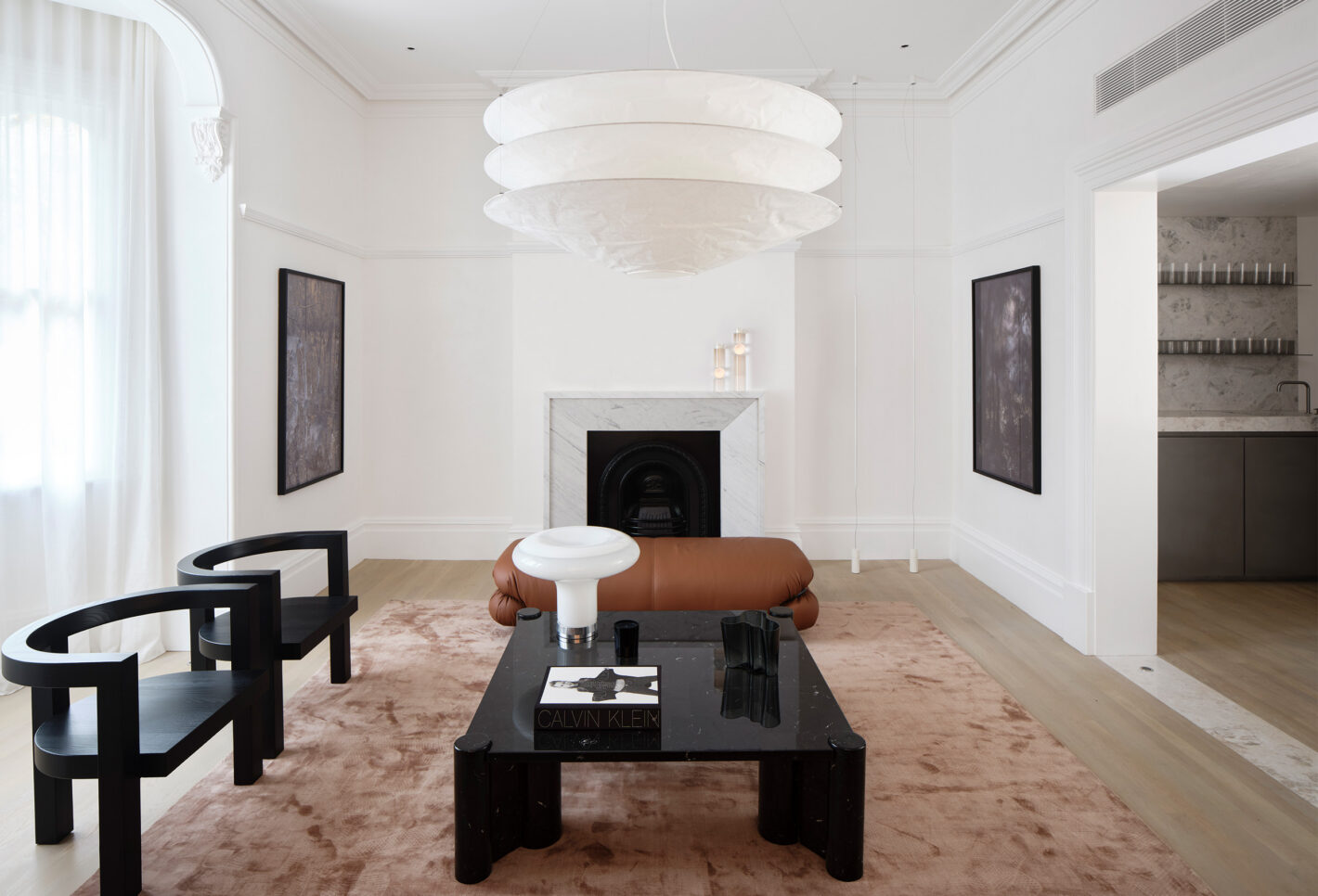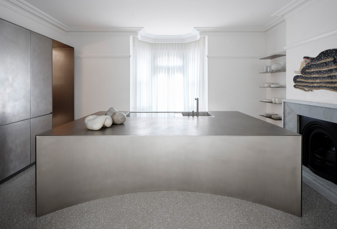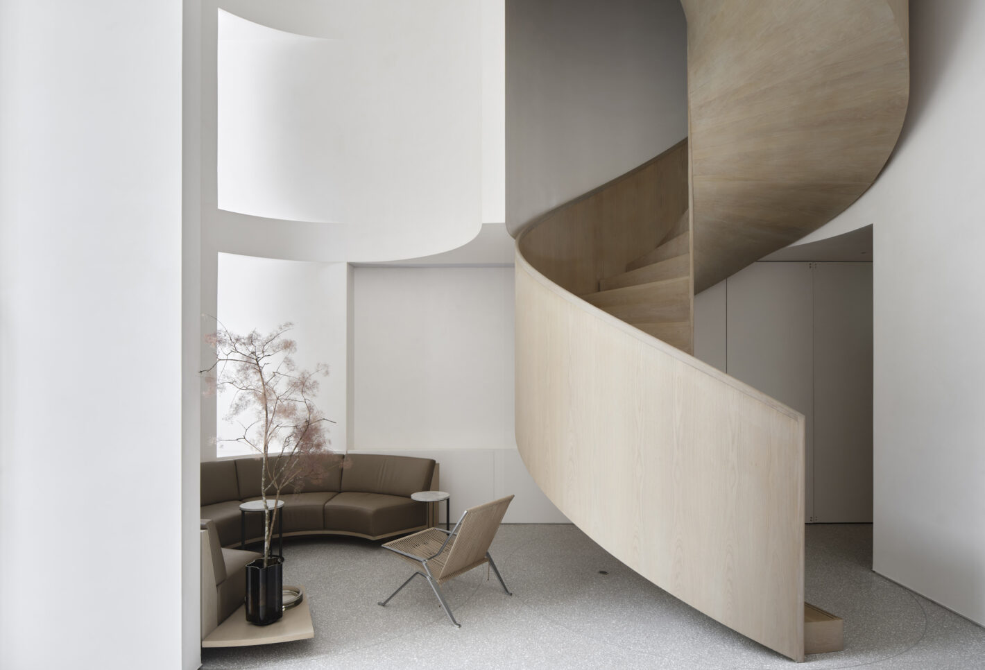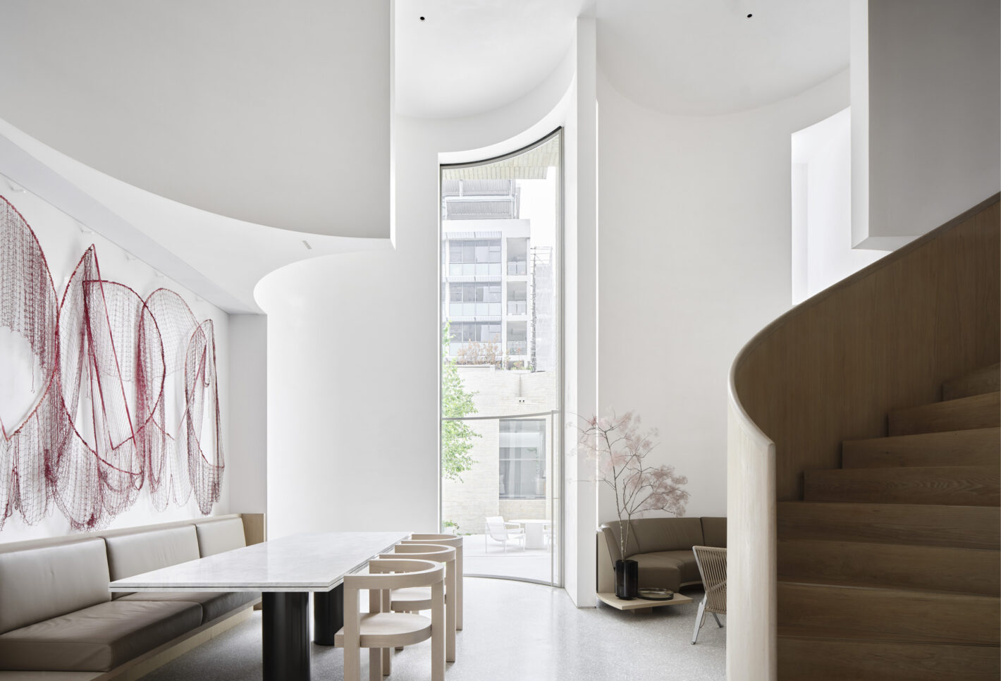 The newly introduced architectural elements act as framing devices, protective walls and recurring sculptural motifs. At times the forms peel away to diffuse natural light, suggesting movement, and generating voids to conceal lighting, structure and services. At other times they become rendered backdrops for bedrooms and a helical spiral staircase.